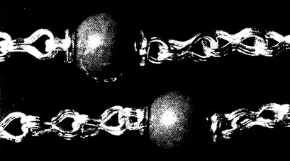 В противоположность цепи, в которой бусины закреплены навитой проволокой, в данной цепи бусины вплетены непосредственно в цепь, если звено достаточной длины и его сжатая центральная часть способна вместить бусину. Размер данного звена с бусиной зависит от ее диаметра, а в самой бусине просверливается отверстие, которое должно быть достаточным для прохождения через него четырех проволок звена; таким образом, маленькие, прозрачные и полупрозрачные бусины не подходят для данной конструкции. Кольца используются для того, чтобы закрывать просверленные отверстия и выгодно подчеркивать бусины. Большой размер звена для бусины требует некоторого изменения обычных процедур; они будут даны в инструкциях там, где это необходимо. Цепь с перпендикулярно расположенными сжатыми звеньями и нанизанными бусинами легче изготовить, чем цепь 5 - одиночную цепь с нанизанными бусинками.