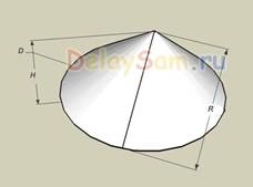 Допустим, нам надо изготовить конус диаметром D см и высотой H сантиметров. Совершенно понятно, что в качестве заготовки будет выступать круг с вырезанным сегментом. Известны два параметра – диаметр и высота. По теореме Пифагора рассчитаем диаметр круга заготовки (не путайте с радиусом готового конуса) Половина диаметра (радиус) и высота образуют прямоугольный треугольник. Поэтому: